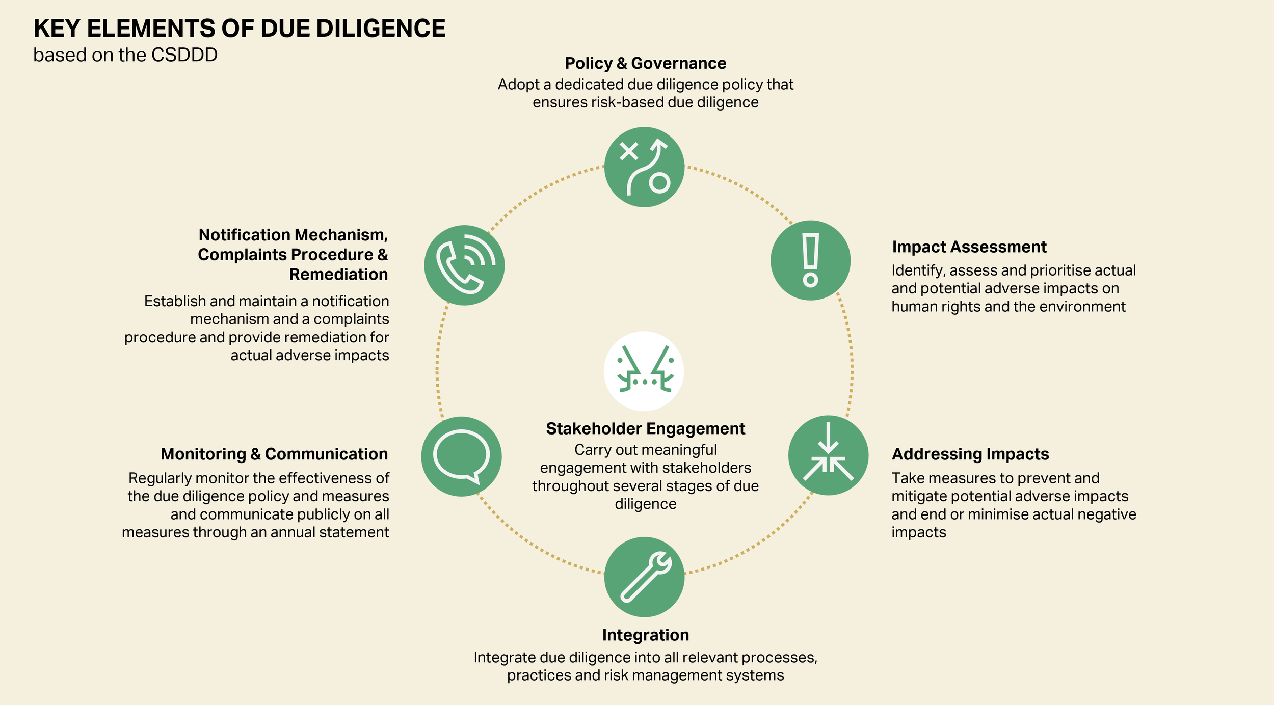 However, the core architecture of obligations remains unchanged. Starting in 2029, companies in scope will be required to conduct due diligence as set out below – reflecting the risk-based due diligence framework originally developed under the UN Guiding Principles on Business and Human Rights (UNGPs) and the OECD Guidelines for Multinational Enterprises: